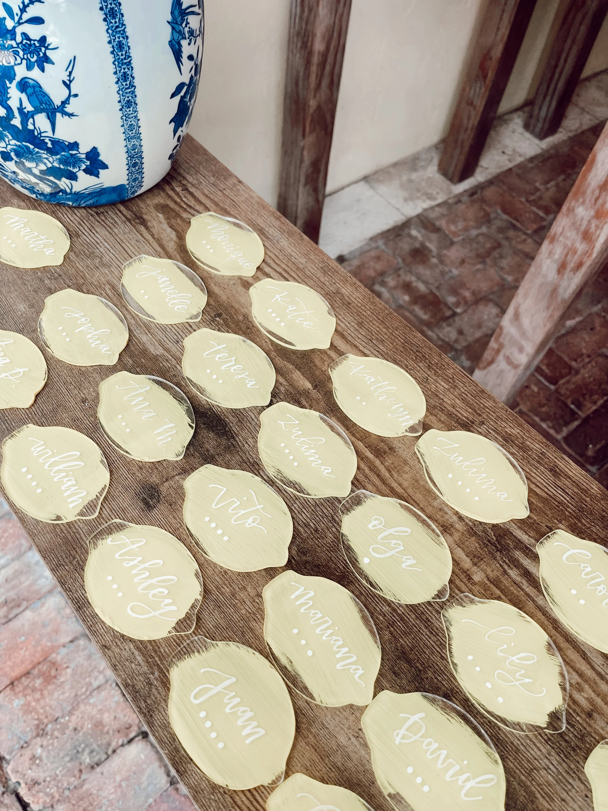 Personalize your tablescape and delight your guests with our acrylic hand-lettered/ and painted place cards. Various shapes available.